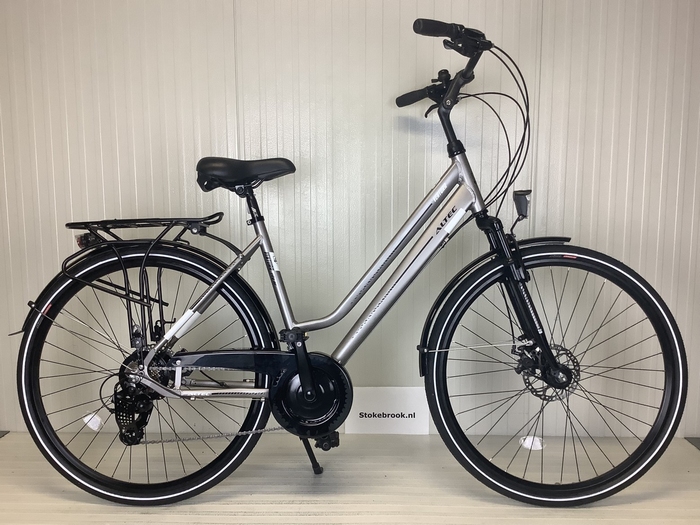 Met 21 versnellingen, schijfremmen, aluminium frame, verende voorvork en batterijverlichting.
